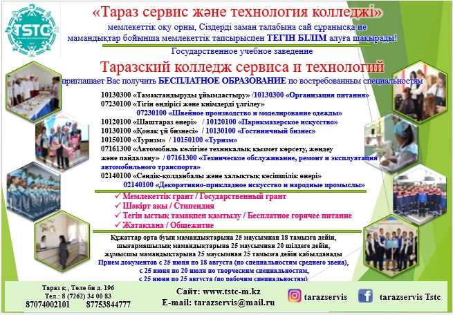 Қазіргі уақытта Жамбыл облысы білім басқармасының "Тараз сервис және технологиялар колледжі" КМҚК - білім алушылардың, педагогтардың, жұмыс берушілердің және басқа да мүдделі тараптардың мүддесі үшін жұмыс істейтін, өзекті білім беру жүйесі, ашық ақпараттық орта және қазіргі заманғы инфрақұрылымы бар білім беру мекемесі.