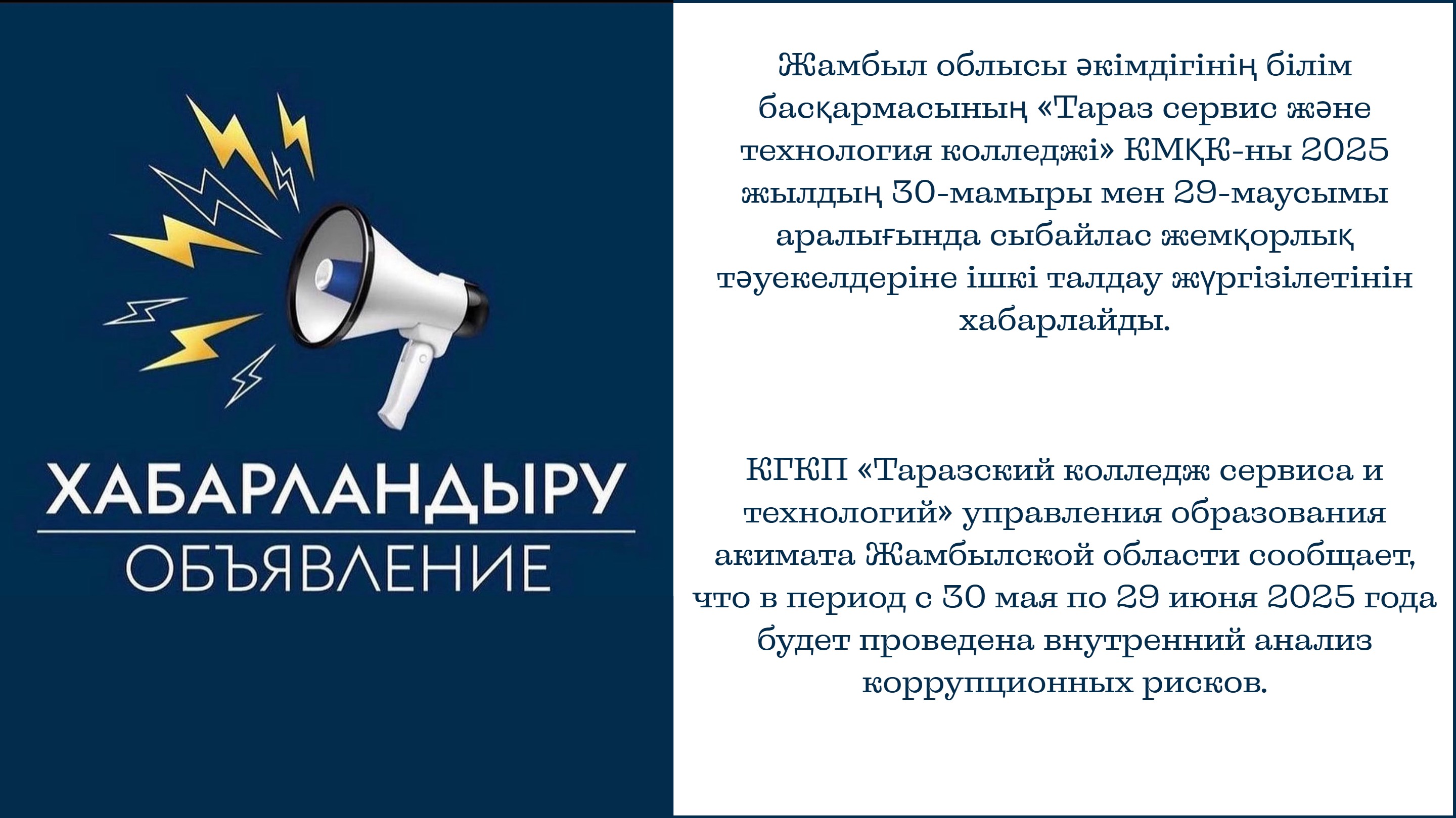 Қазіргі уақытта Жамбыл облысы білім басқармасының "Тараз сервис және технологиялар колледжі" КМҚК - білім алушылардың, педагогтардың, жұмыс берушілердің және басқа да мүдделі тараптардың мүддесі үшін жұмыс істейтін, өзекті білім беру жүйесі, ашық ақпараттық орта және қазіргі заманғы инфрақұрылымы бар білім беру мекемесі.